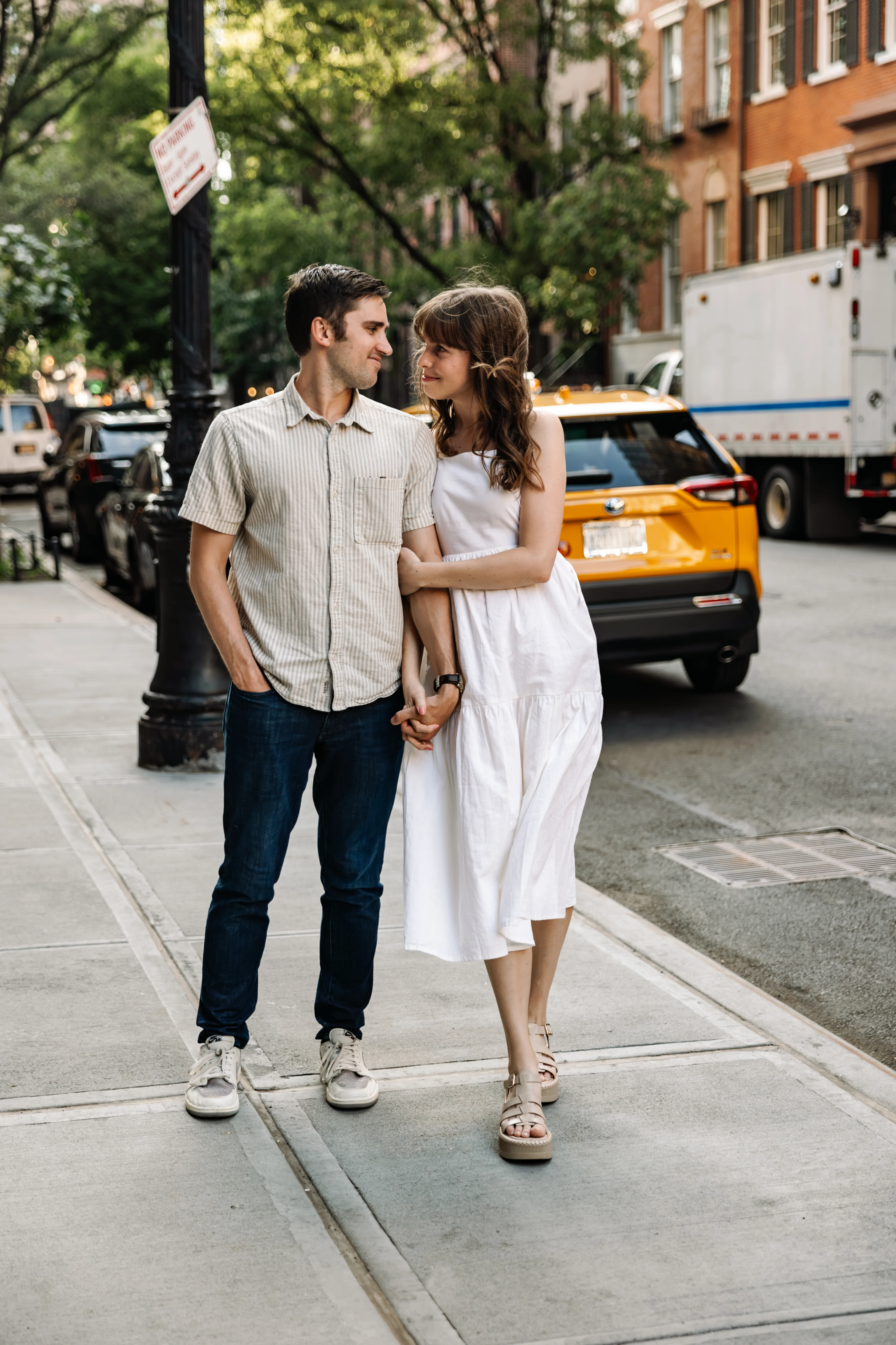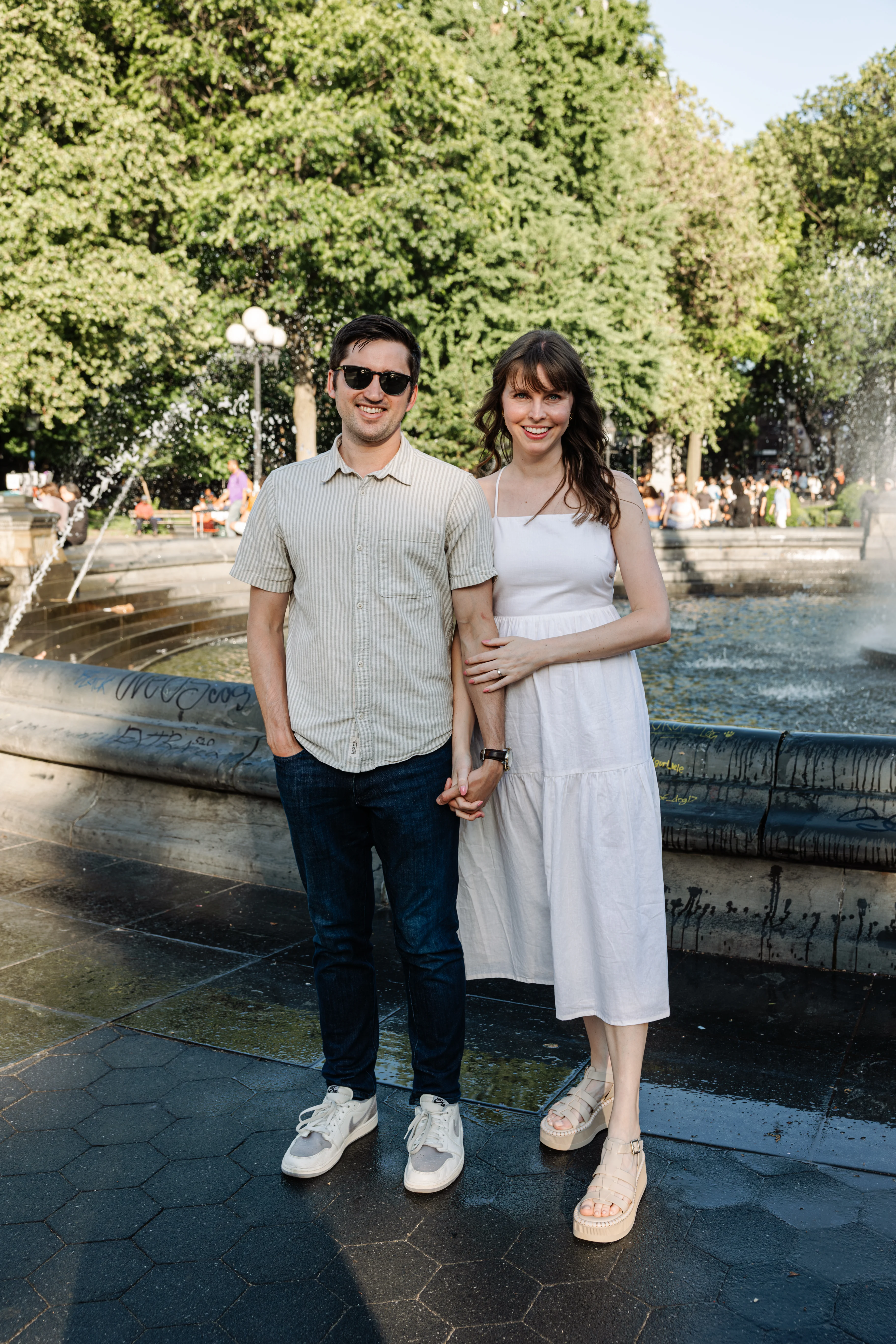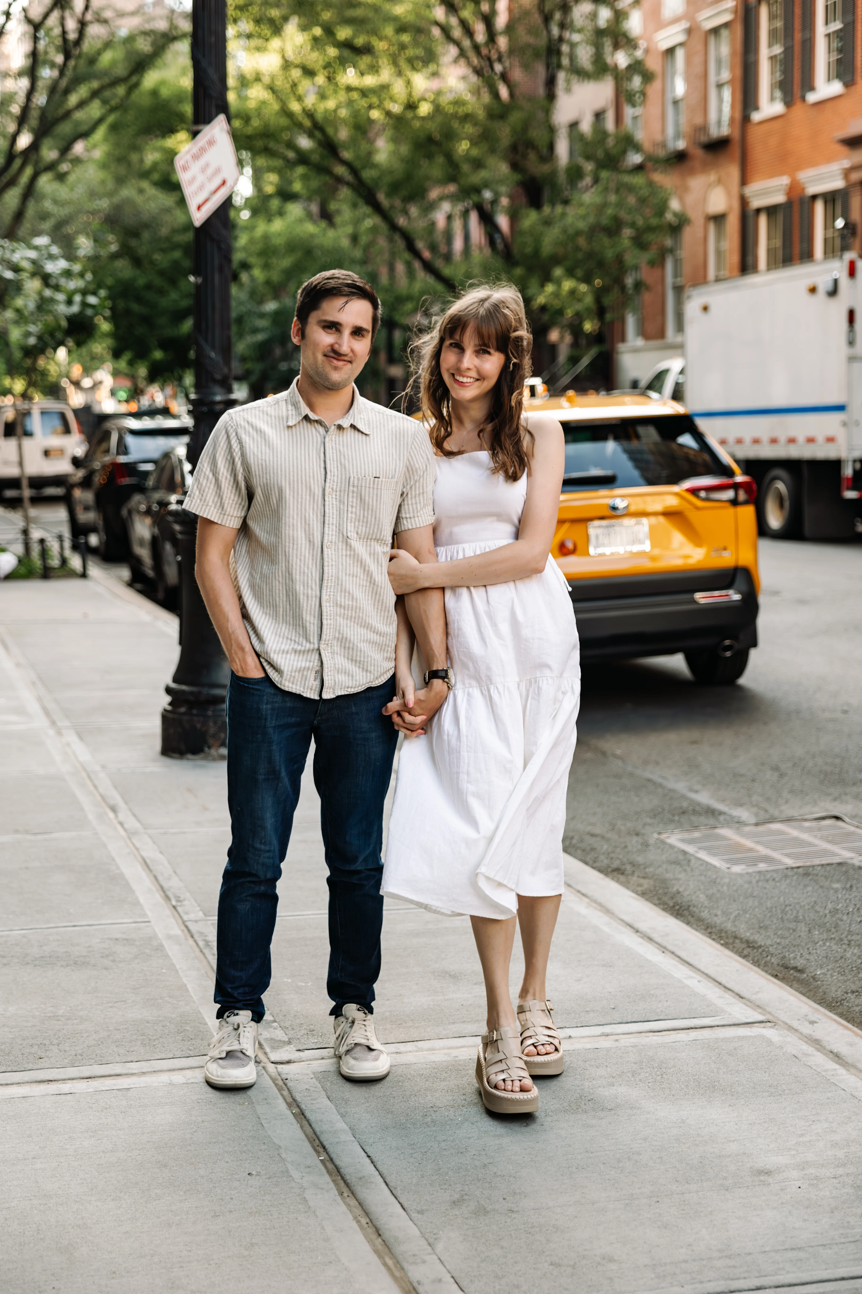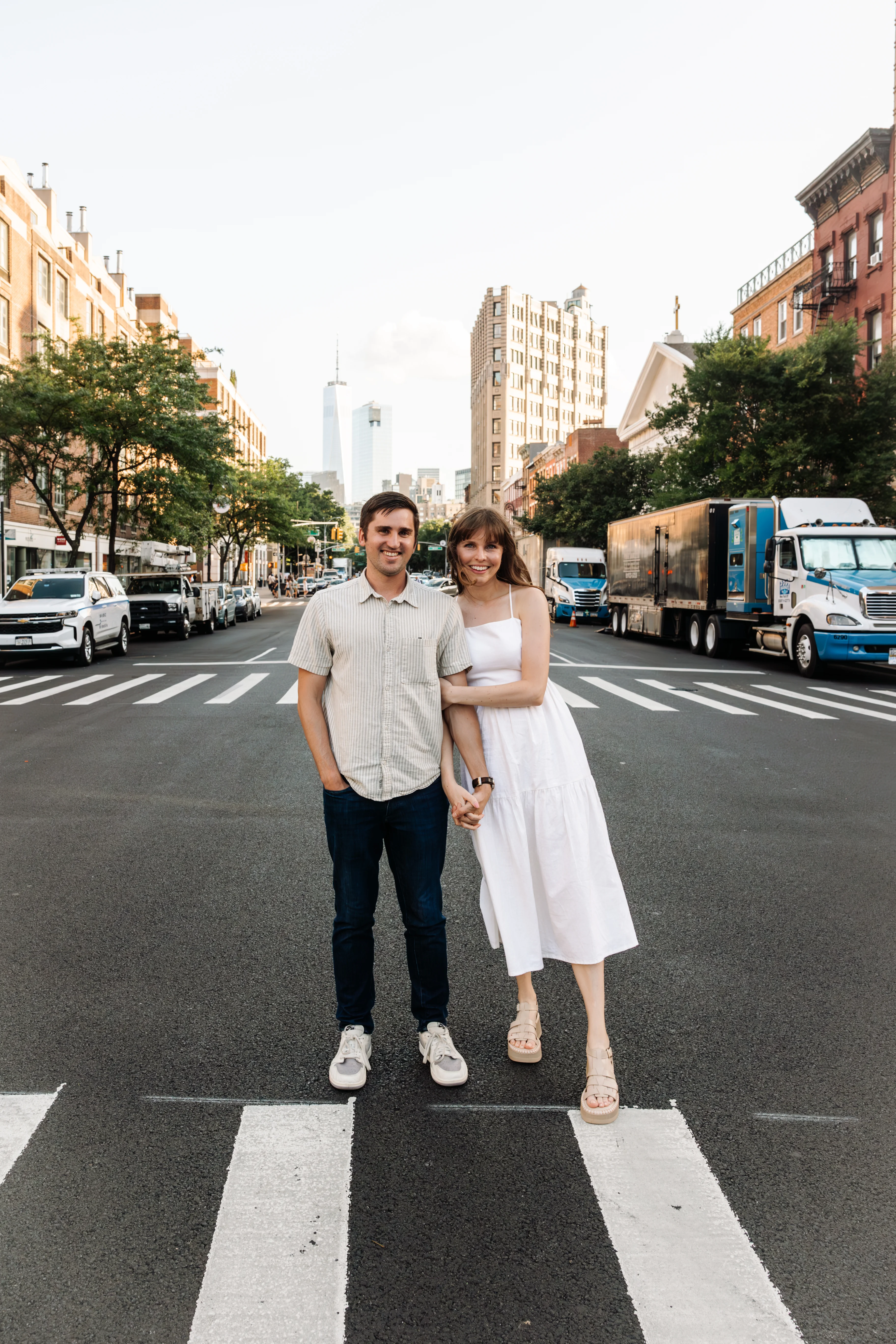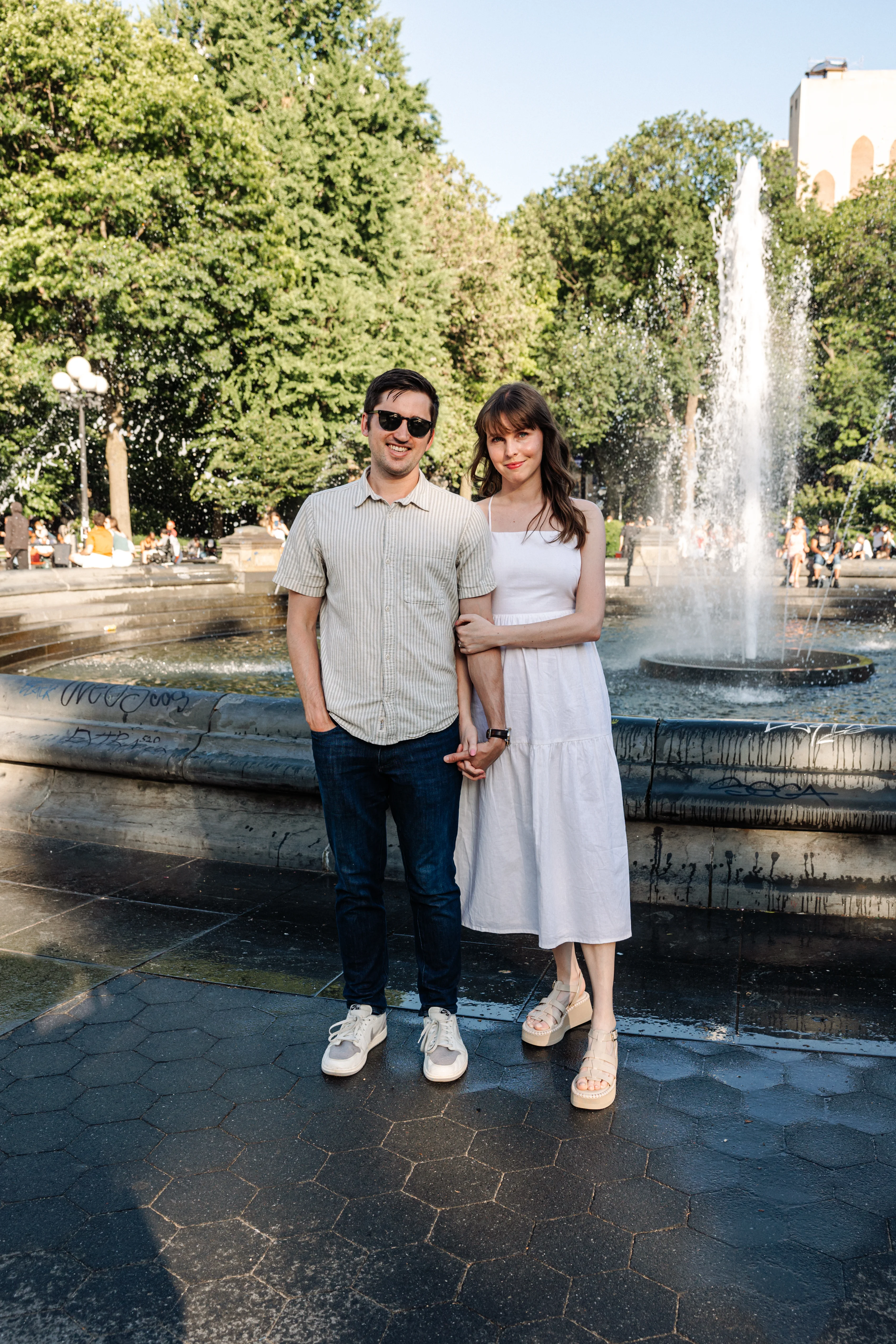 It was warm, Maggie was in all white - already David's wife for years, and still very much his bride. We started at Washington Mews and wound our way through the streets of Greenwich Village, yellow cabs rolling by in that perfectly chaotic way, through Washington Square Park (with the fountain bursting!), all the way to the middle of Sixth Avenue where IYKYK — one of the best views of the Freedom Tower in the entire city. We finished up right outside of their subway stop.