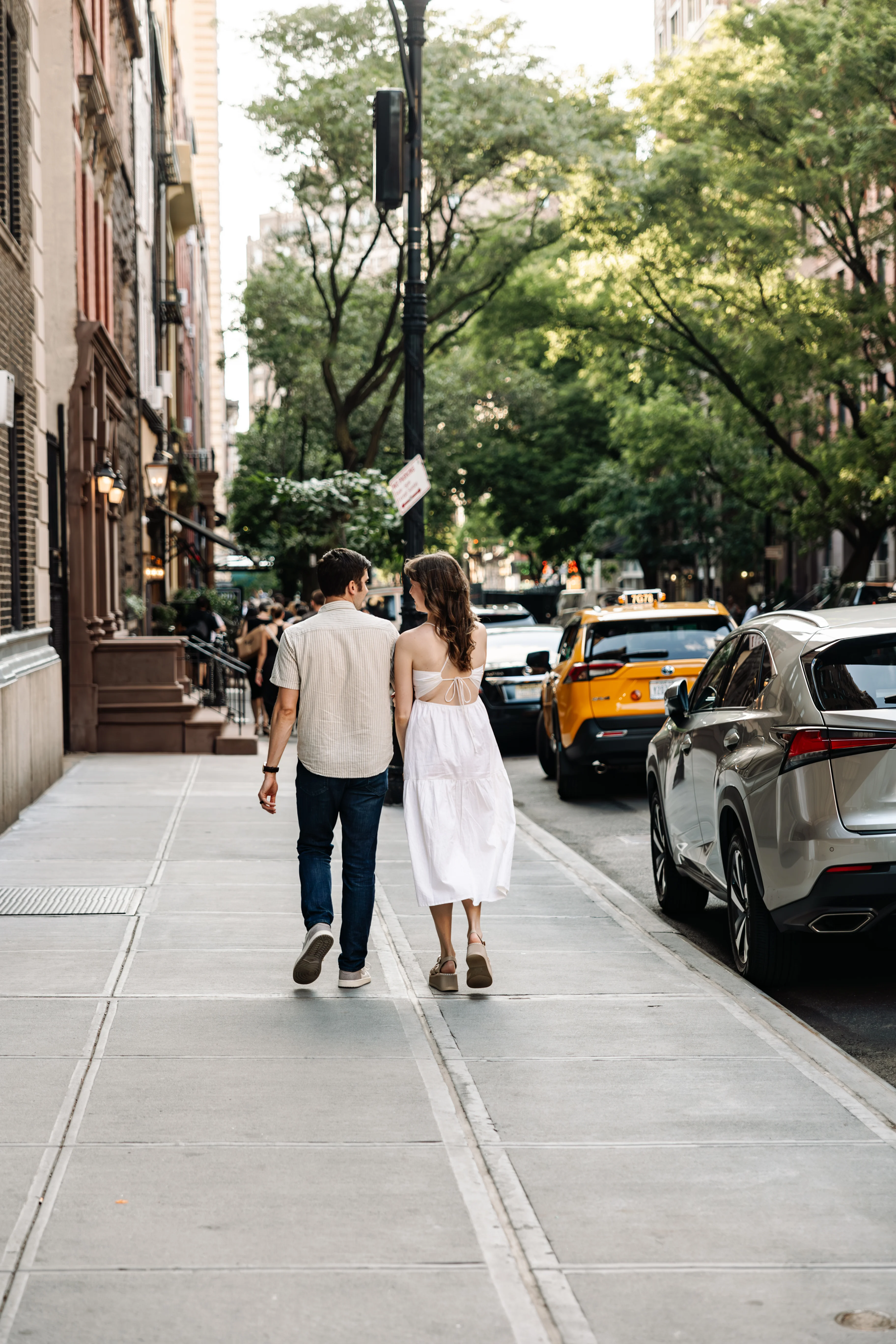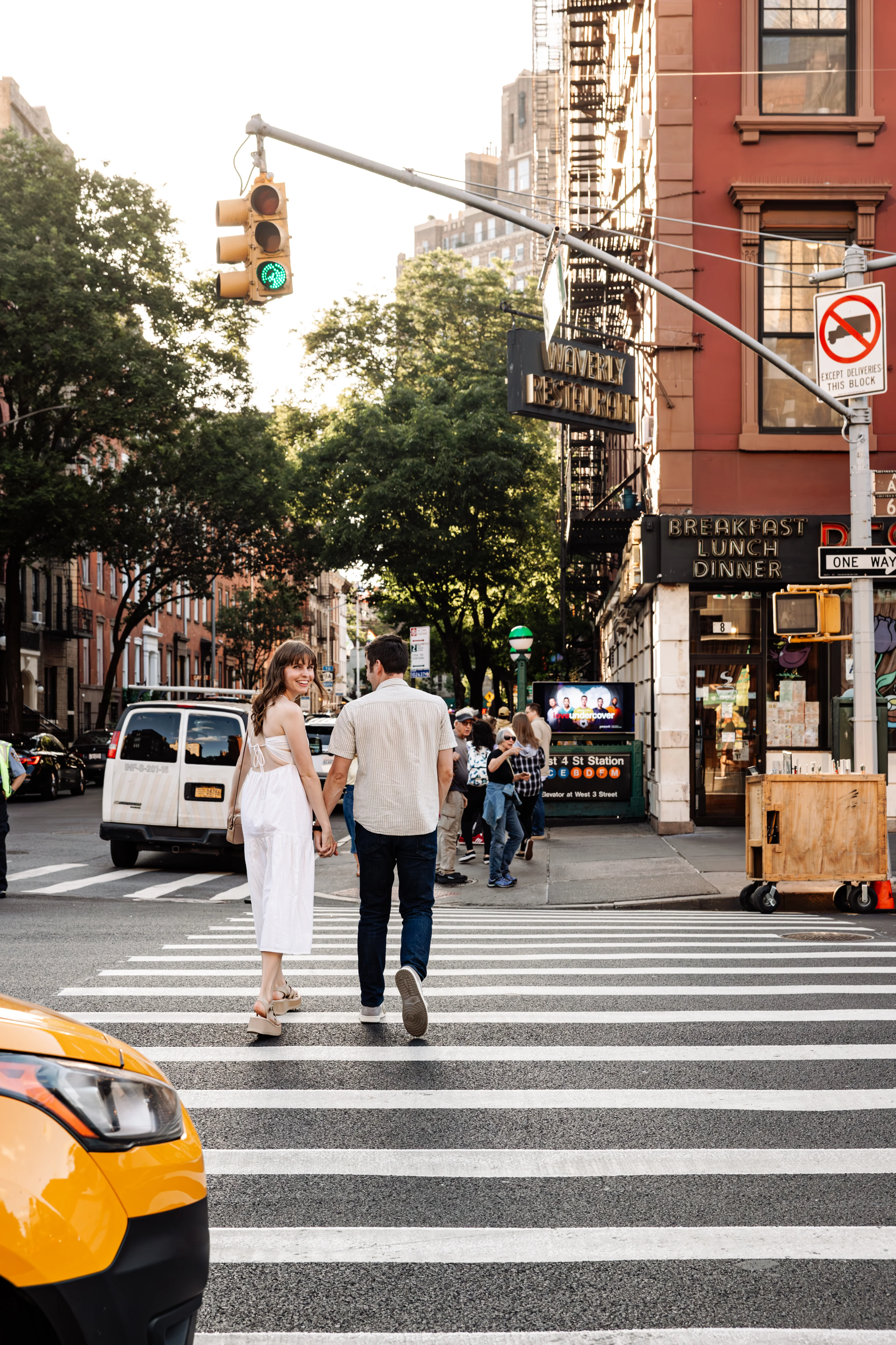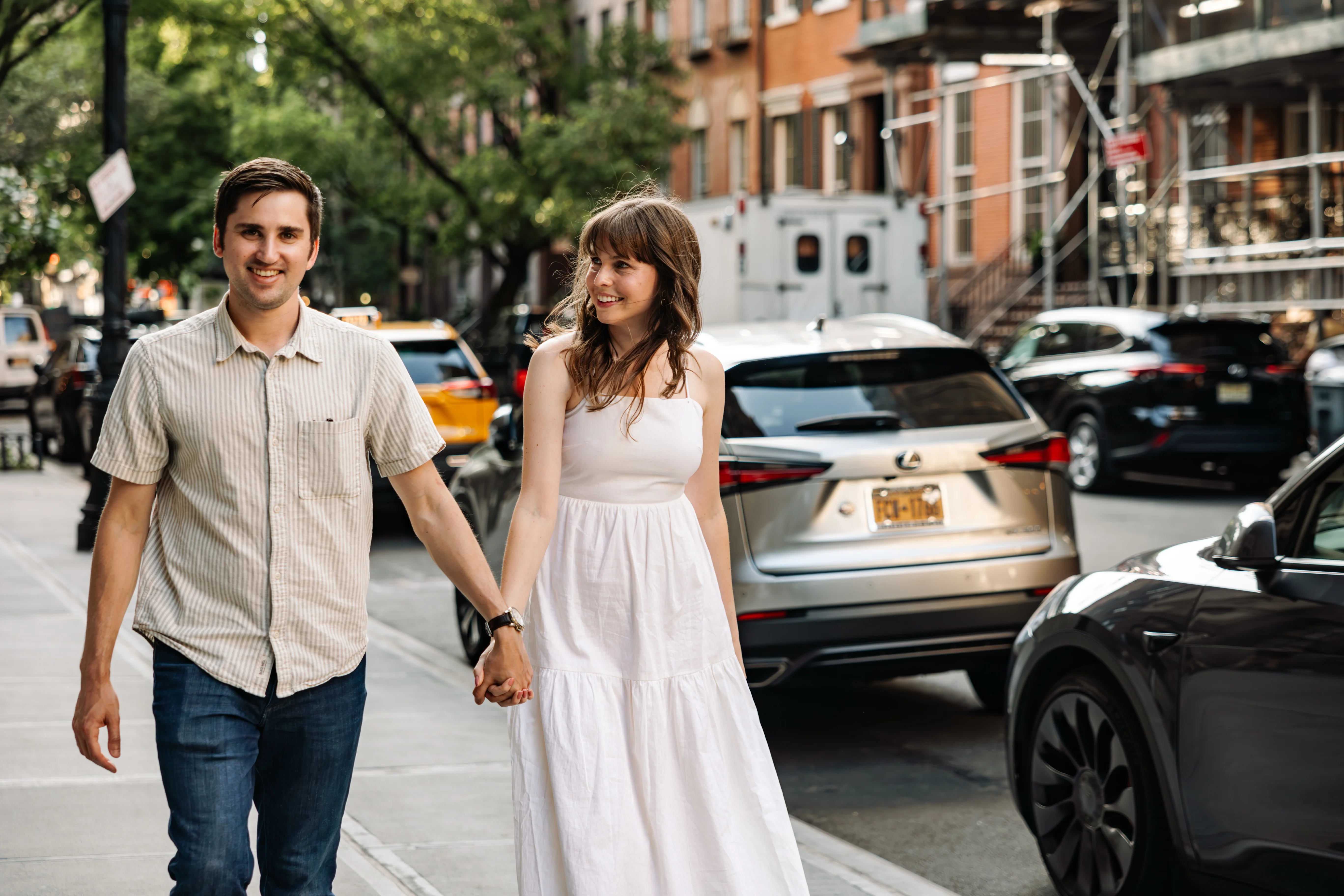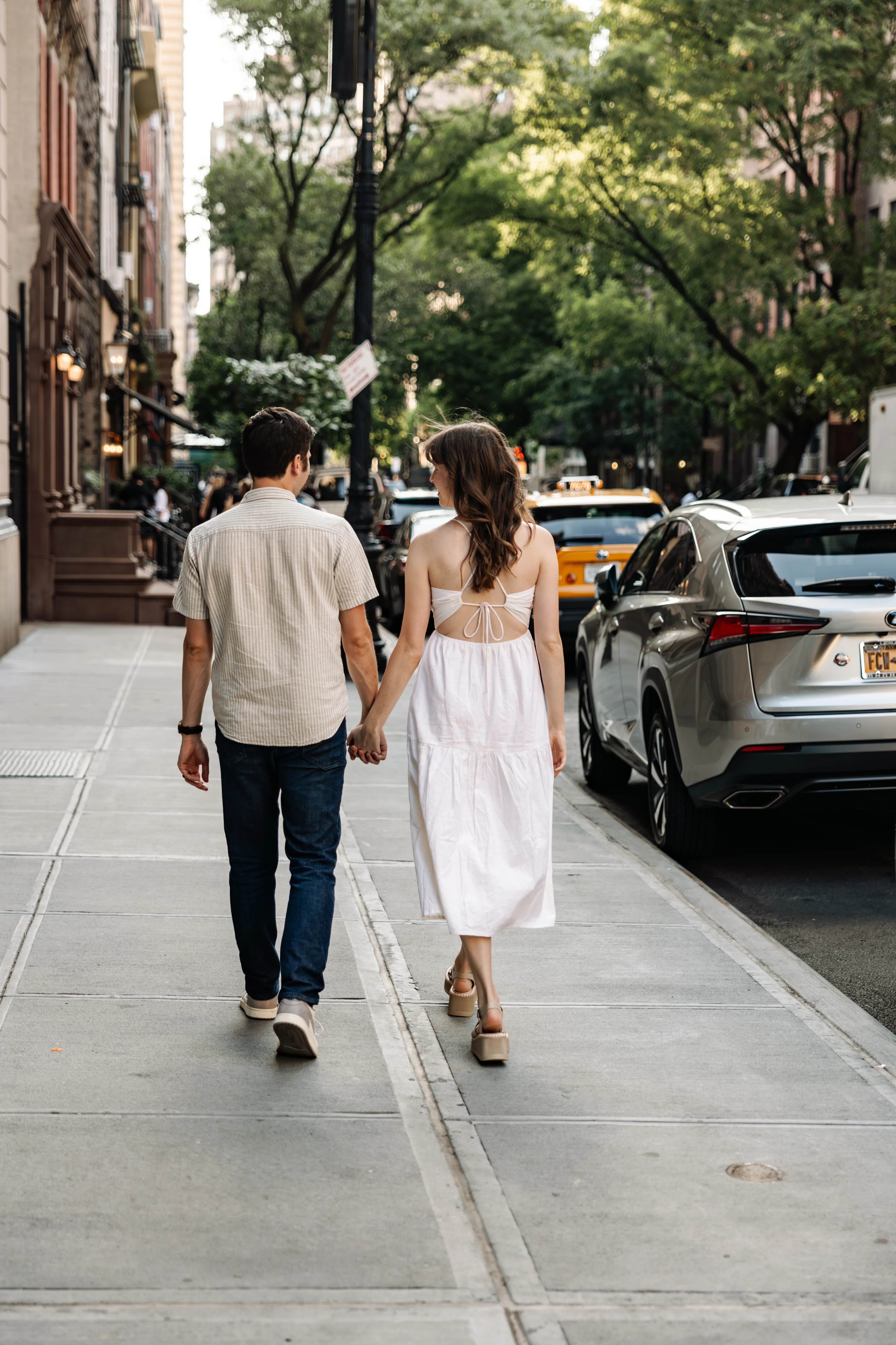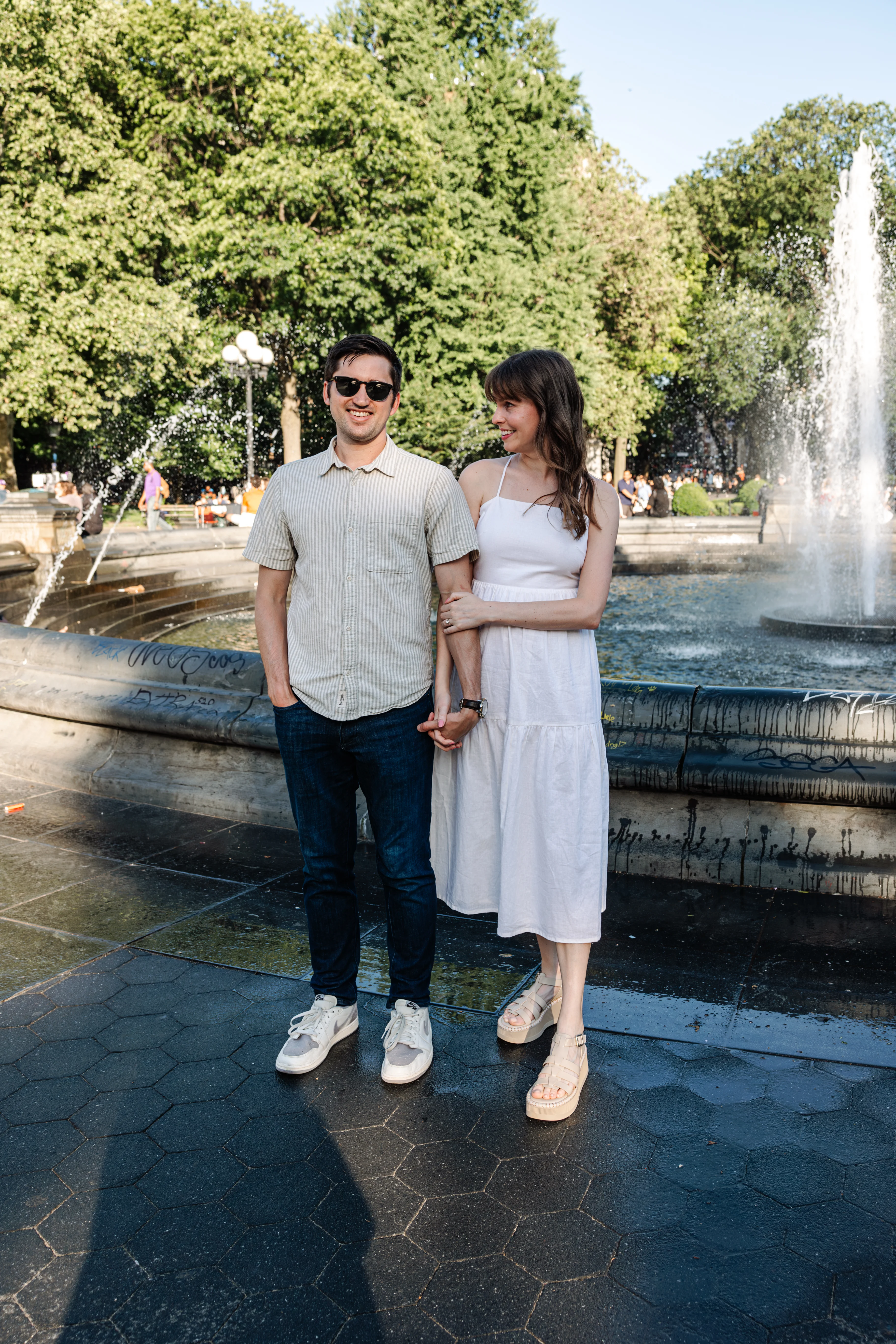 It was warm, Maggie was in all white - already David's wife for years, and still very much his bride. We started at Washington Mews and wound our way through the streets of Greenwich Village, yellow cabs rolling by in that perfectly chaotic way, through Washington Square Park (with the fountain bursting!), all the way to the middle of Sixth Avenue where IYKYK — one of the best views of the Freedom Tower in the entire city. We finished up right outside of their subway stop.