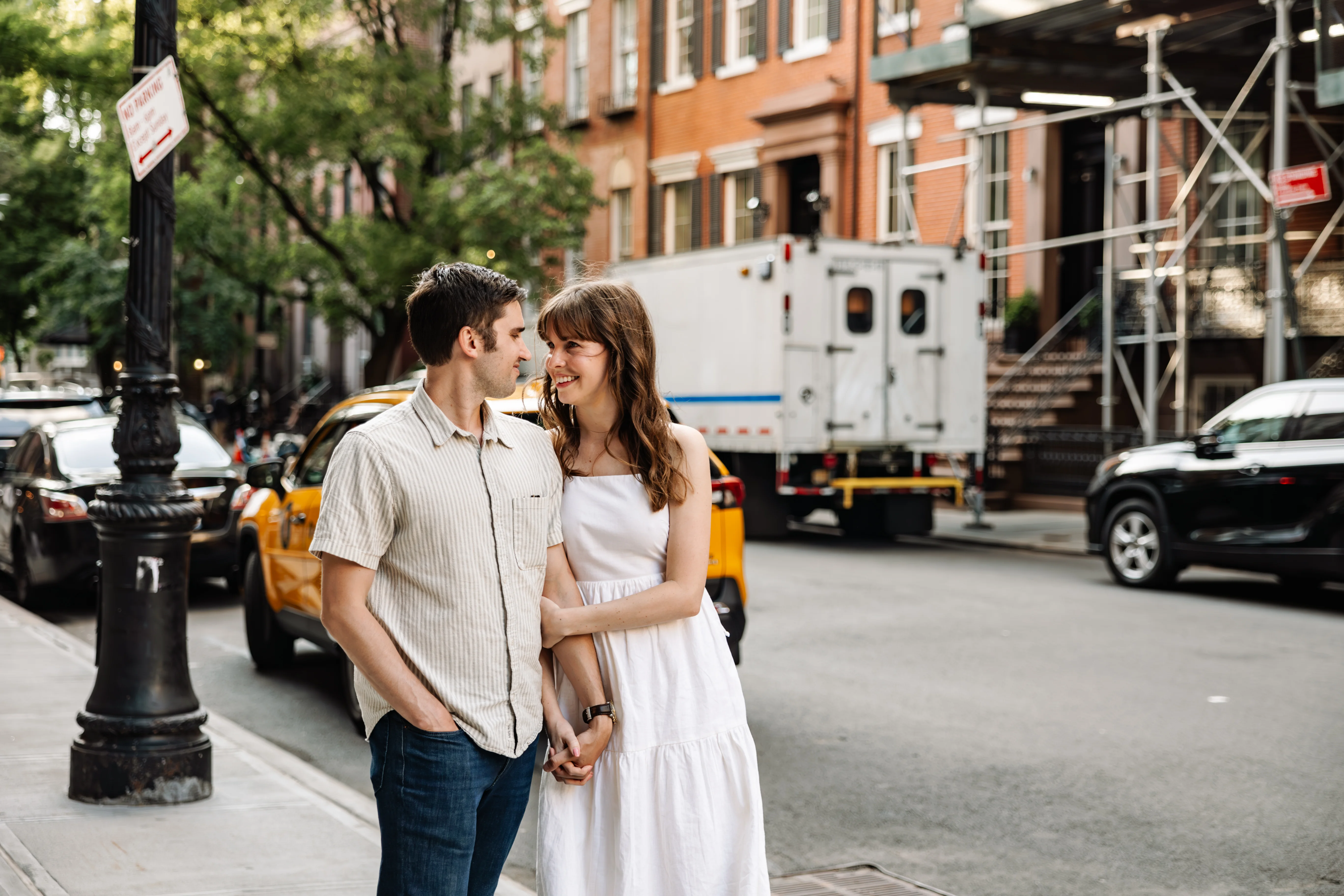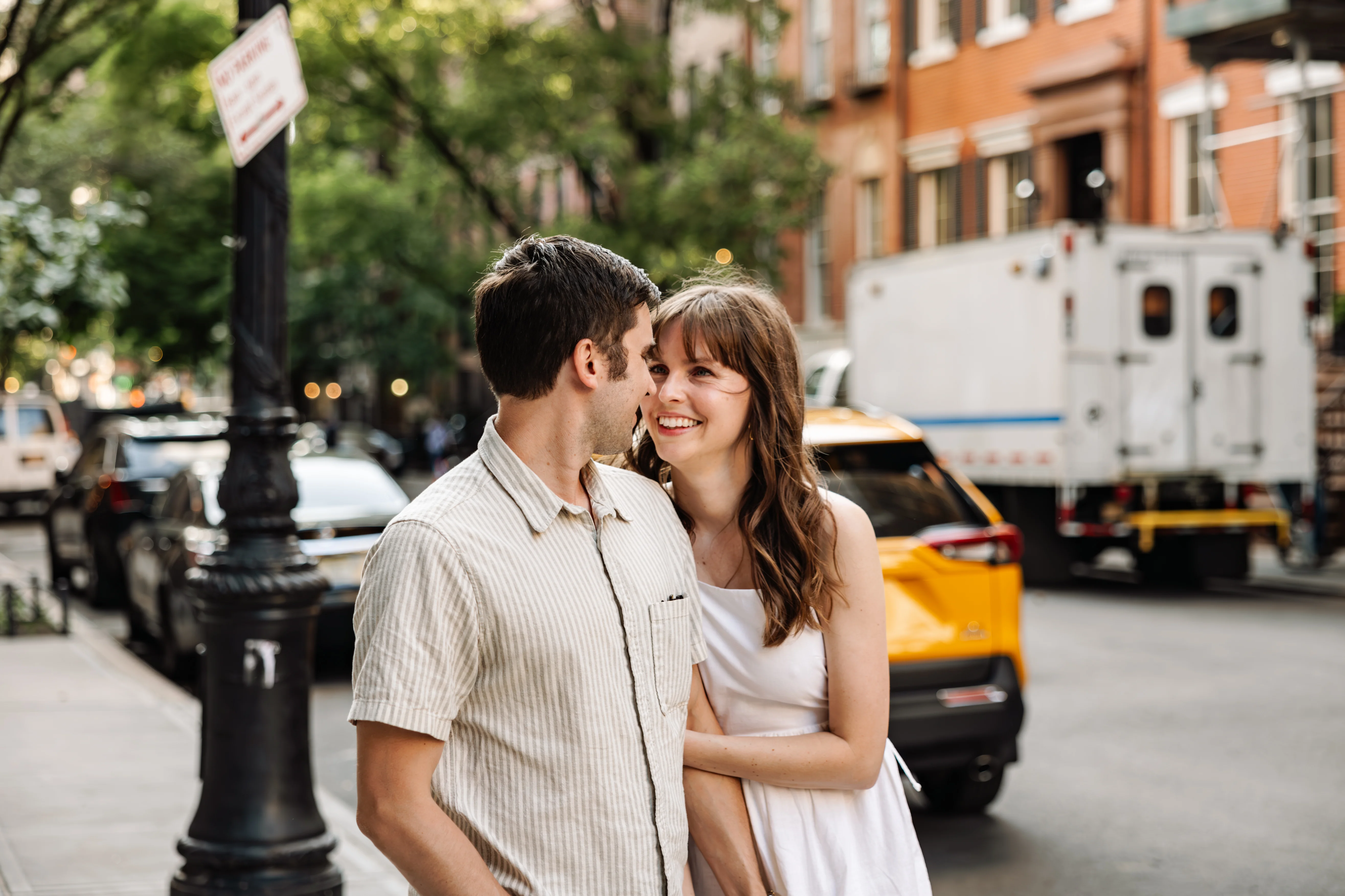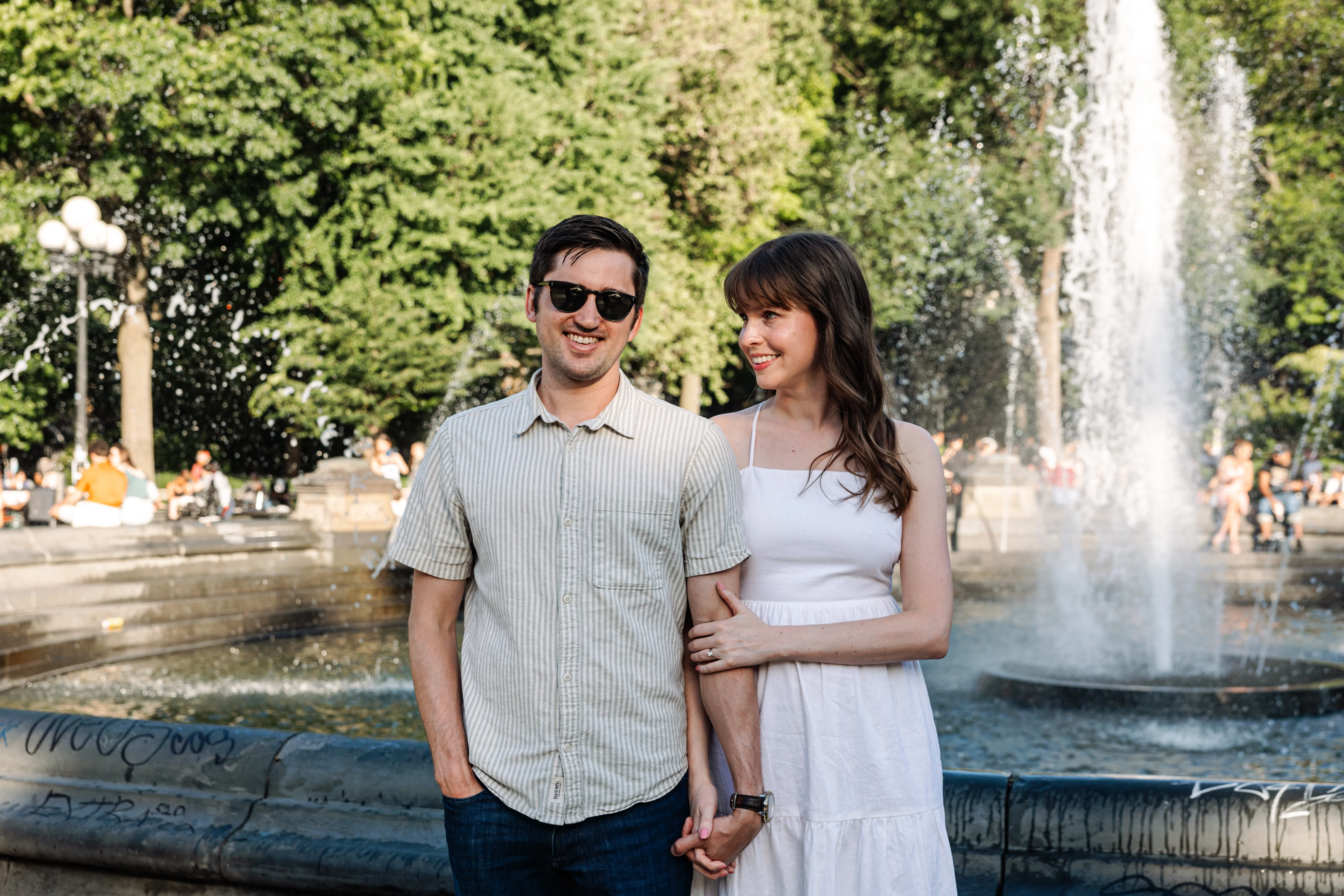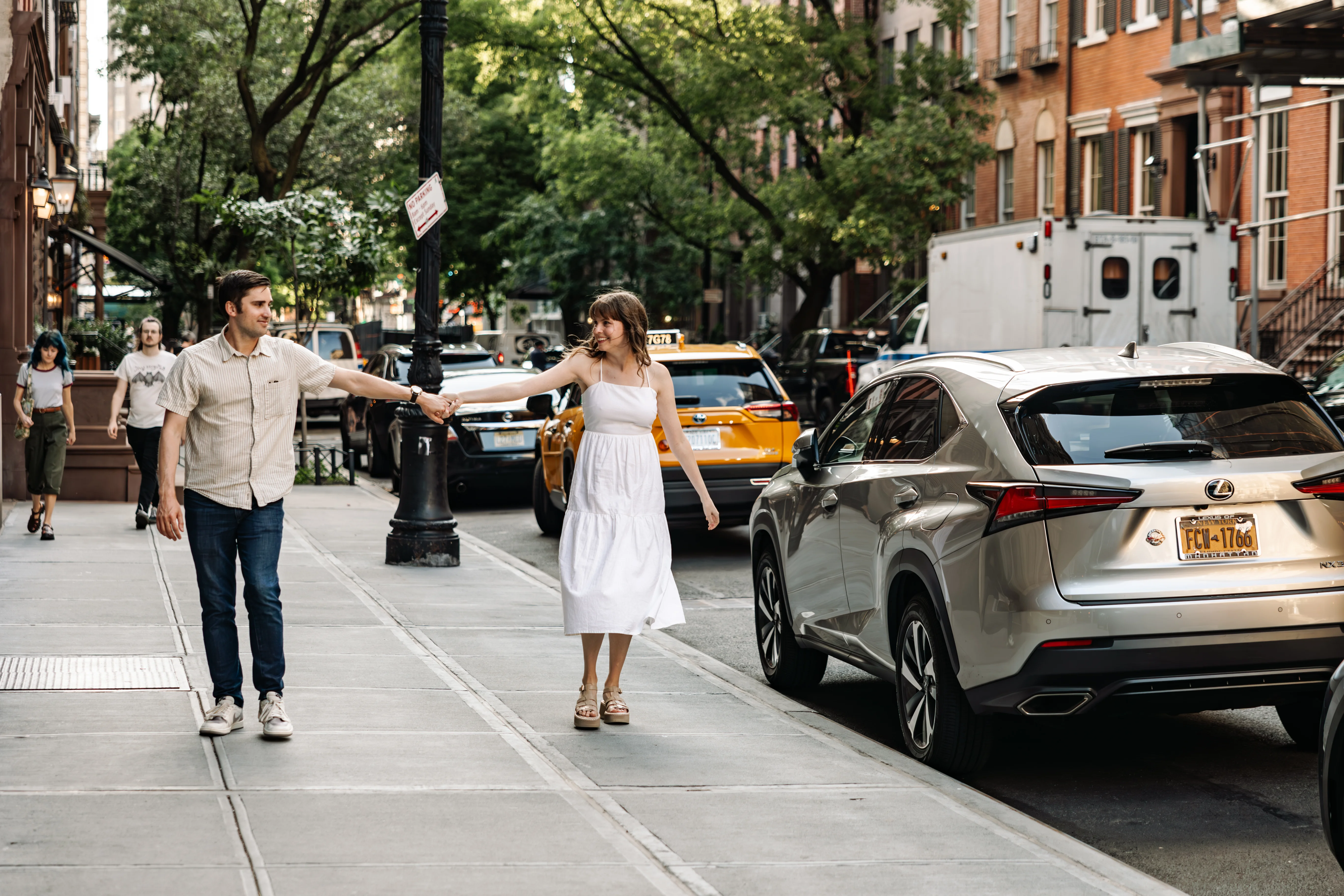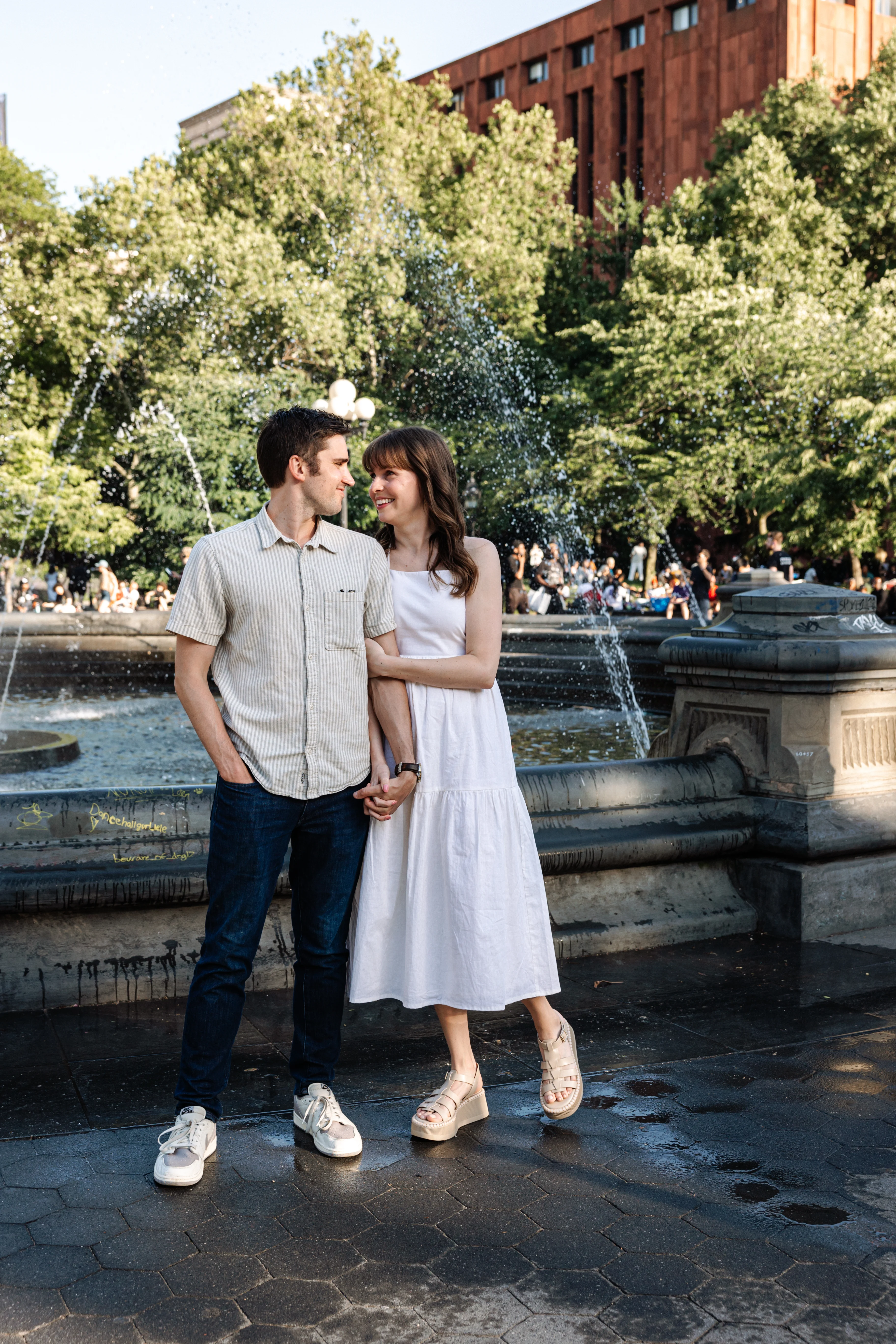 It was warm, Maggie was in all white - already David's wife for years, and still very much his bride. We started at Washington Mews and wound our way through the streets of Greenwich Village, yellow cabs rolling by in that perfectly chaotic way, through Washington Square Park (with the fountain bursting!), all the way to the middle of Sixth Avenue where IYKYK — one of the best views of the Freedom Tower in the entire city. We finished up right outside of their subway stop.